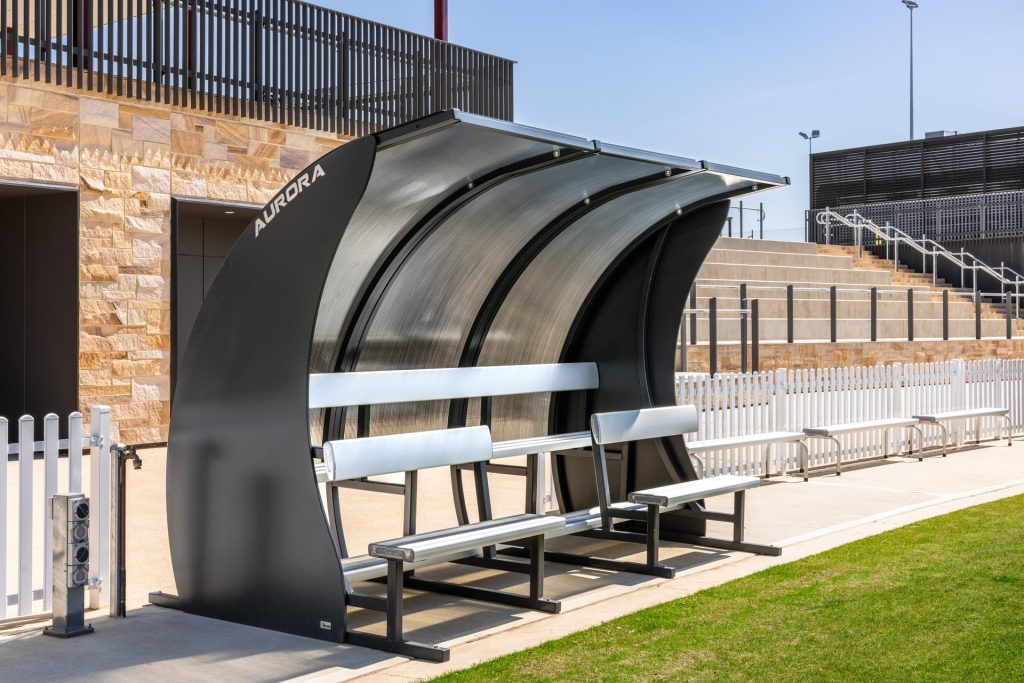 The Aurora Players Shelter/Technical Bench is made using Tinted Ultra UV Polycarbonate material, making it 4 degrees cooler than clear acrylic. It hosts a superior shelter overhang to enable greater sun and wet weather protection to players and coaches (center of seat to roof overhang = 900mm)